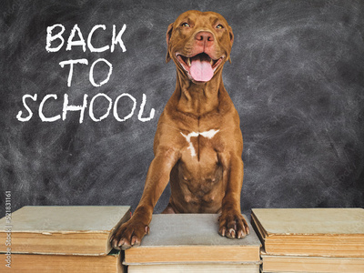 Back to school. Lovable, adorable puppy and vintage books. Close-up, isolated background. Studio shot, day light. Concept of care, education, obedience training and raising of pets