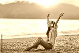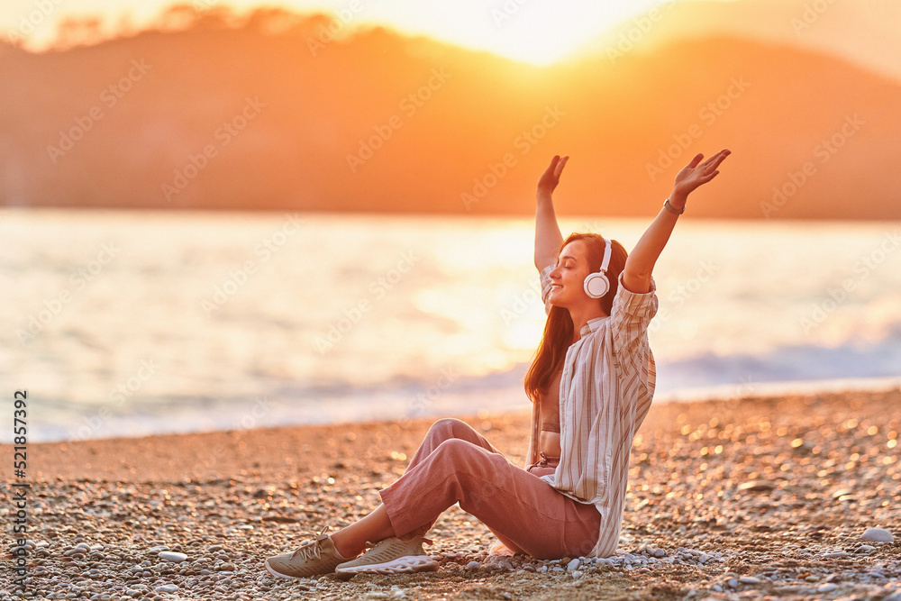 Happy alone woman with open arms and closed eyes enjoys of listening relax traveling music on the seashore at sunset time