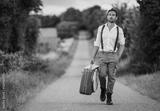 Individual man in vintage clothing holding a suitecase is walking along a street in nature