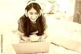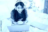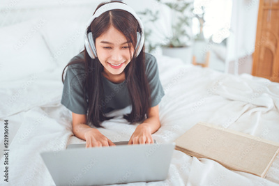 Happy woman relaxing while wearing headphones watching videos on laptop lying on a bed at home, Chill out and leisure concept