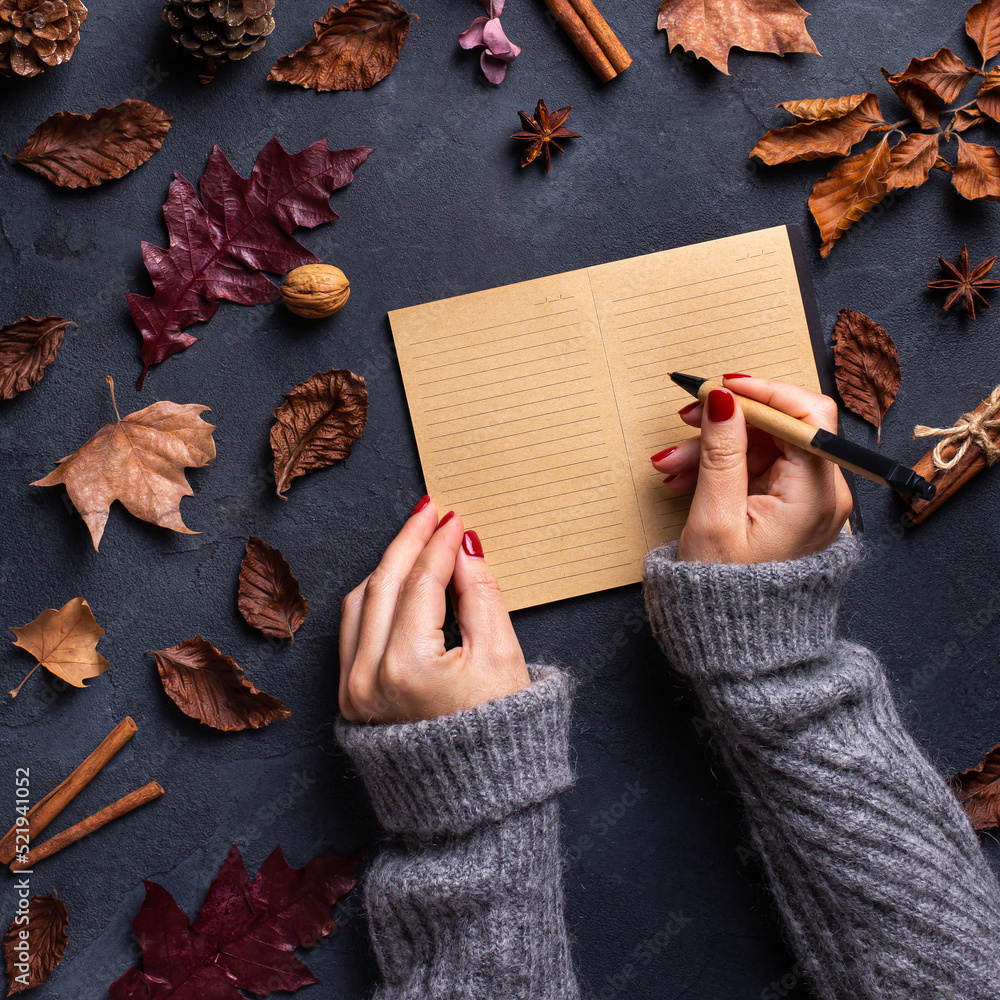 Autumn fall thanksgiving day composition with decorative dried leaves