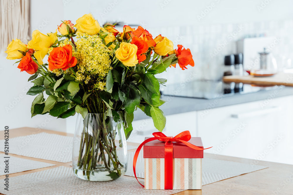 Yellow and orange roses in a vase and gift box with red ribbon on kitchen counter table with modern kitchen background. Gift for Thanksgiving day, birthday, Mother's or Valentine's day. Copy space