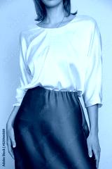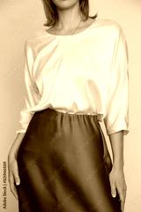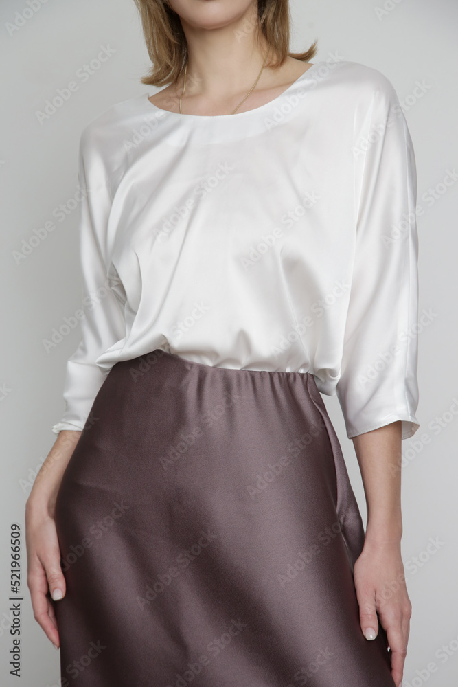Series of studio photos of young female model wearing white silk satin batwing short sleeve blouse with mocha color midi skirt