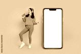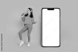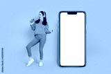 Full length body size view of attractive woman singing listening hit copy space dance isolated on vivid yellow color background