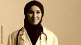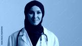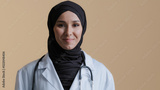 Portrait happy smiling muslim arab woman islamic doctor physician in hijab wear white medical coat looking at camera posing positive young female practitioner professional therapist standing indoors