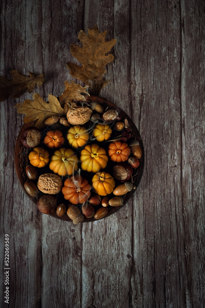 pumpkin shape candles, acorns and nuts on plate, dark wooden background. autumn seasonal composition. symbol of harvest, Mabon, thanksgiving holiday, Halloween. fall time. witch magic ritual. top view