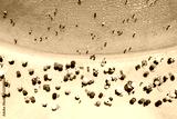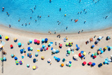 Aerial view of colorful umbrellas on sandy beach, people in blue sea at sunset in summer. Tuerredda Beach, Sardinia, Italy. Tropical landscape with turquoise water. Travel and vacation. Top view