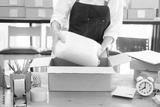 Asian female clothes shop owner folding a t-shirt and packing in a cardboard parcel box.