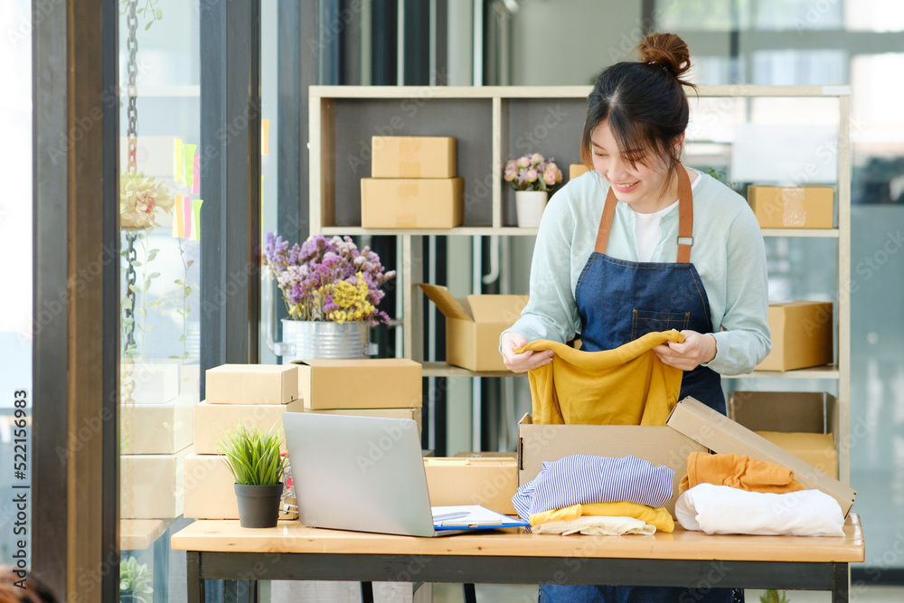 Asian female clothes shop owner folding a t-shirt and packing in a cardboard parcel box.