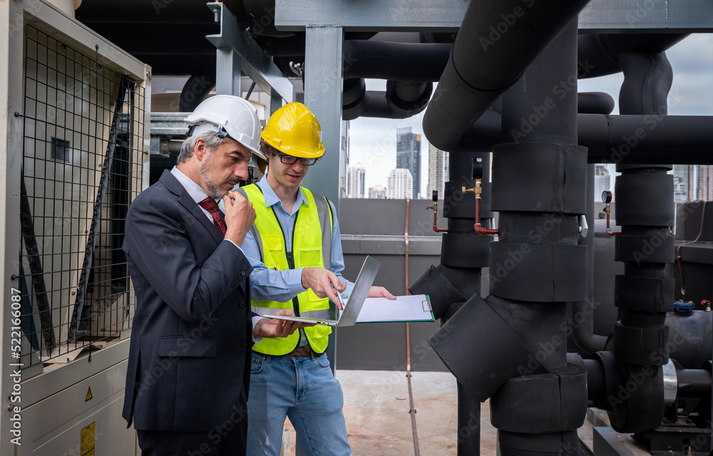 Manager and engineer under checking the industry cooling tower air conditioner is water cooling tower air chiller HVAC of large industrial building to control air system.