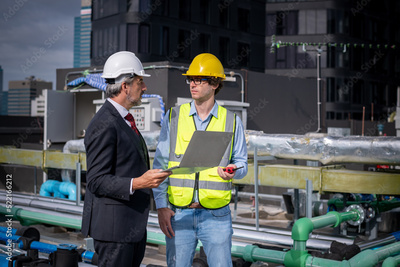 Manager and engineer under checking the industry cooling tower air conditioner is water cooling tower air chiller HVAC of large industrial building to control air system.