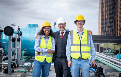 Manager and engineer under checking the industry cooling tower air conditioner is water cooling tower air chiller HVAC of large industrial building to control air system.