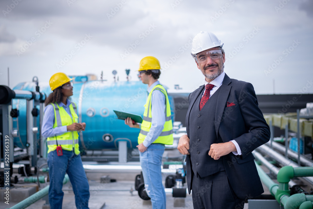 Manager and engineer under checking the industry cooling tower air conditioner is water cooling tower air chiller HVAC of large industrial building to control air system.