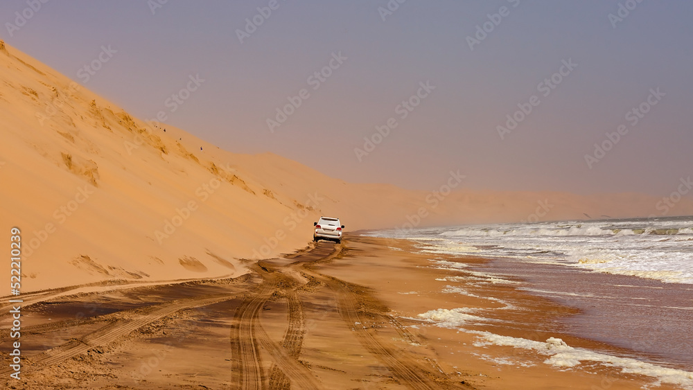 The off-road vehicle drives off-road, between the dune and the ocean at sunset. Sandwich Harbor. Namibia