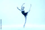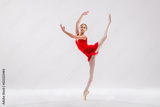 Beautiful young ballerina on a white background. The ballerina is dressed in a red leotard, pink leotards, pointe shoes.