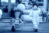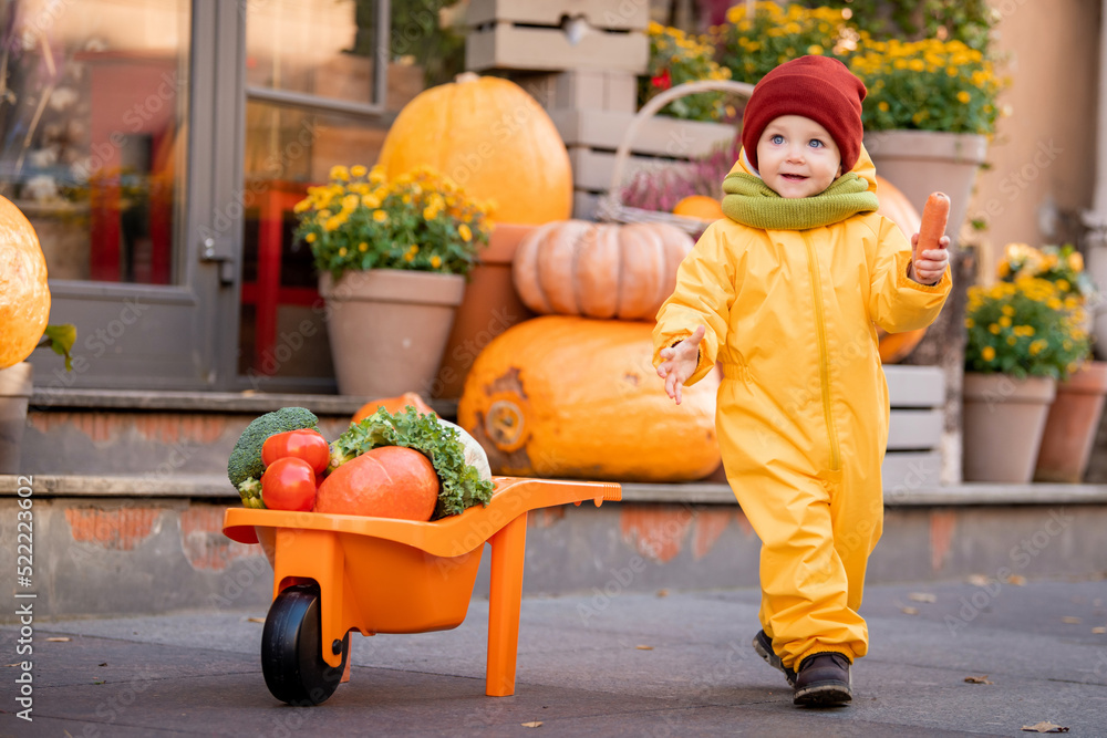 kid in a yellow overalls drives toy car filled with vegetables among large pumpkins at fall fair.