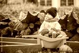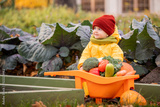 a child in yellow overalls drives a toy car with vegetables against the backdrop of a vegetable garden and cabbage beds