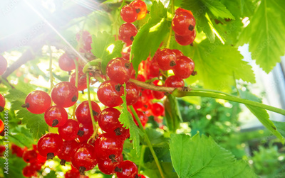 Red currants on a bush on a sunny day.