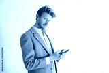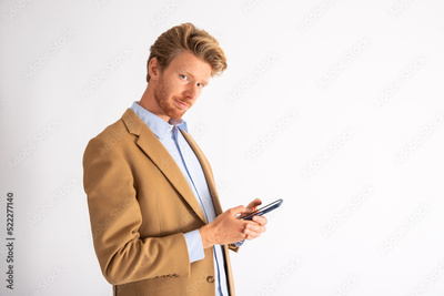 Portrait of smiling businessman using mobile phone. Young Caucasian manager texting message and looking at camera. Mobile app and technology concept