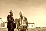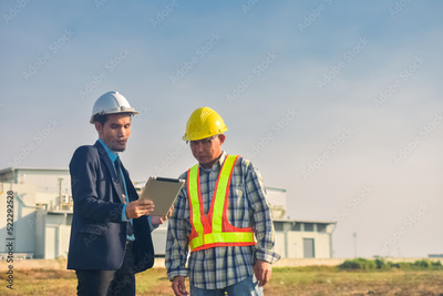 Asian engineer and foreman worker with touch pad discuss, plan working for the outdoors building construction site.