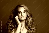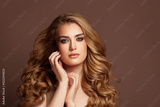 Fashion glamorous woman with perfect wavy ginger hairstyle on brown background portrait