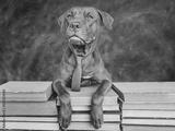 Back to school. Lovable, adorable puppy and vintage books. Close-up, isolated background. Studio shot, day light. Concept of care, education, obedience training and raising of pets