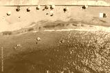 Wild beach with a small number of vacationing tourists swimming on the ocean coast, aerial view.