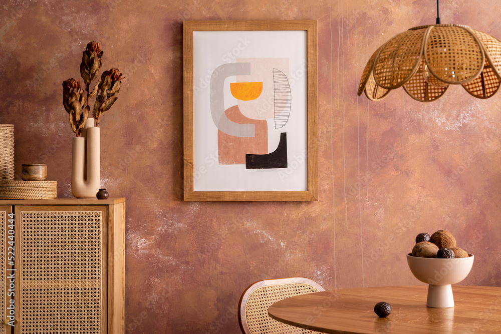 Minimalist composition of boho and outstanding dining room interior with mock up poster. Round table with rattan chair, commode and flowers. Brown grunge wall. Template. Cozy home decor