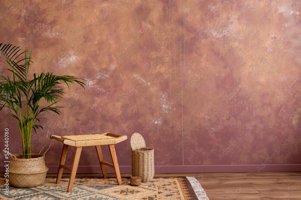 Stylish boho and vintage dinning room interior with copy space, rattan chair, palm tree and personal accessories. Brown grunge wall. Cozy home decor. Template.