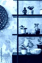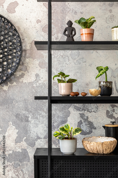 Modern composition of wabi sabi interior with black shelf, decoration, sculptures, elegant personal accessories. Grey concrete wall. Stylish wabi sabi home decor. Template.