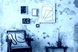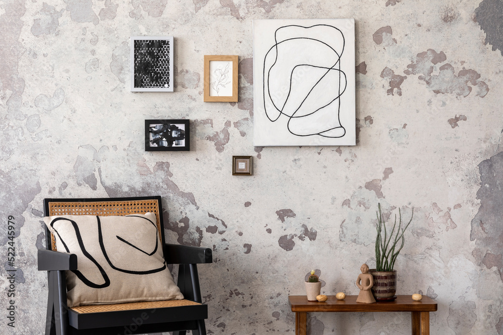 Loft style of modern apartment with design black chair, shelf, carpet and composition of wall art gallery. Minimalist home decor. Template. Grunge concrete wall.