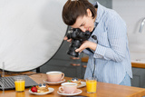 blogging, profession and people concept - female food photographer with camera photographing pancakes, coffee and orange juice in kitchen at home