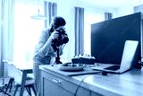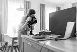blogging, profession and people concept - happy smiling female food photographer with camera photographing cake in kitchen at home