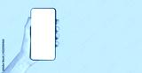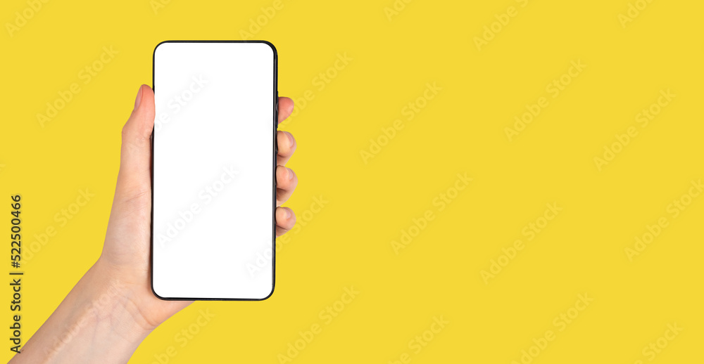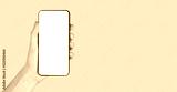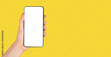 Banner with hand holding phone mockup on yellow background. Smartphone template. Copy space. High quality photo