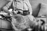 Woman in plaid drinking hot tea from Halloween theme mug, stroking relaxed multicolored cat pet on the sofa at decorated for fall holidays home. Cozy and comfortable autumn holidays. Selective focus.