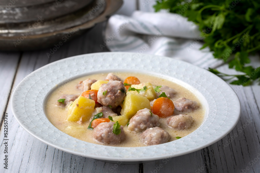 Seasoned soup with meatballs with vegetables. Turkish name; sulu kofte, eksili kofte, terbiyeli kofte)