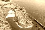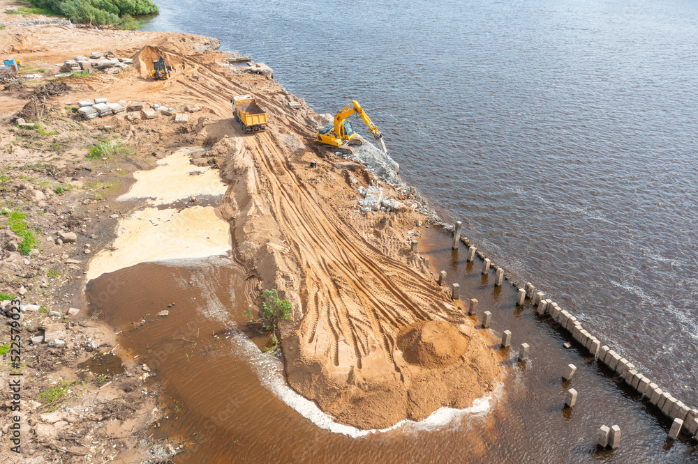 Sprinkling the soil of the river bank with the help of special equipment, top aerial view.