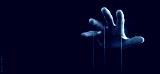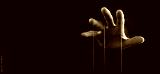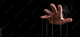 Hand closeup pulling strings, manipulating, controlling. Authority concept. Banner with copy space for text.