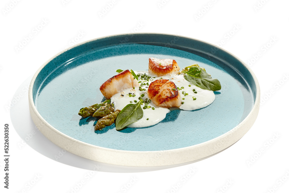Luxury dish - grilled scallops with asparagus and creamy espuma. Roasted scallop with cream sauce and asparagus on white background. Delicacy seafood in restaurant menu - sea scallop.