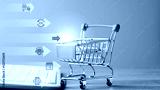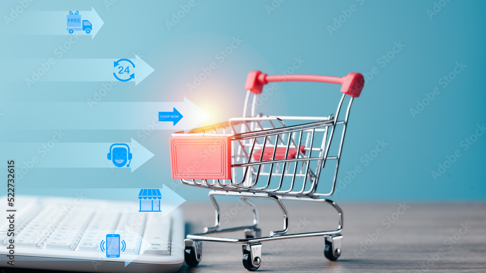 Shopping cart and keyboard on table,Ecommerce concept and online selling website,Retail business with cyberspace technology used to communicate between store owner and customer.