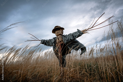 Scary scarecrow in a hat and coat on a evening autumn field. Spooky Halloween holiday concept. Halloweens background