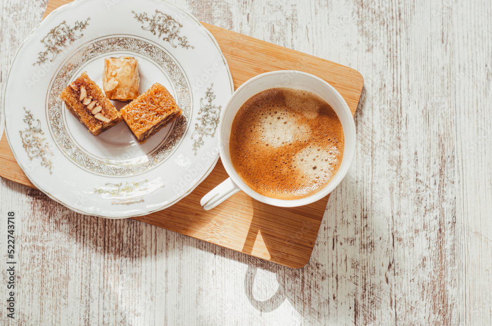 Cup of coffee and Turkish baklava sweets on a wooden table