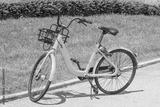 Yellow bicycle with a basket on the footboard in the parking lot near the green city lawn on the footpath.