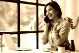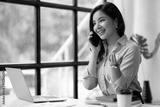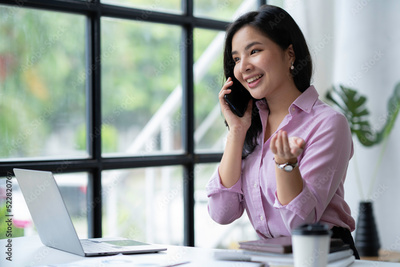 Beautiful Asian businesswoman smiling and talking on the phone holding customers talking and answering business questions at an office desk.