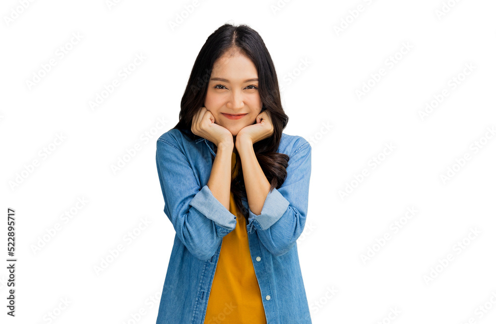 Cute and beautiful Asian confidential woman smile, positive natural lovely Thai girl teenager in jeans and yellow shirt isolated in studio..
