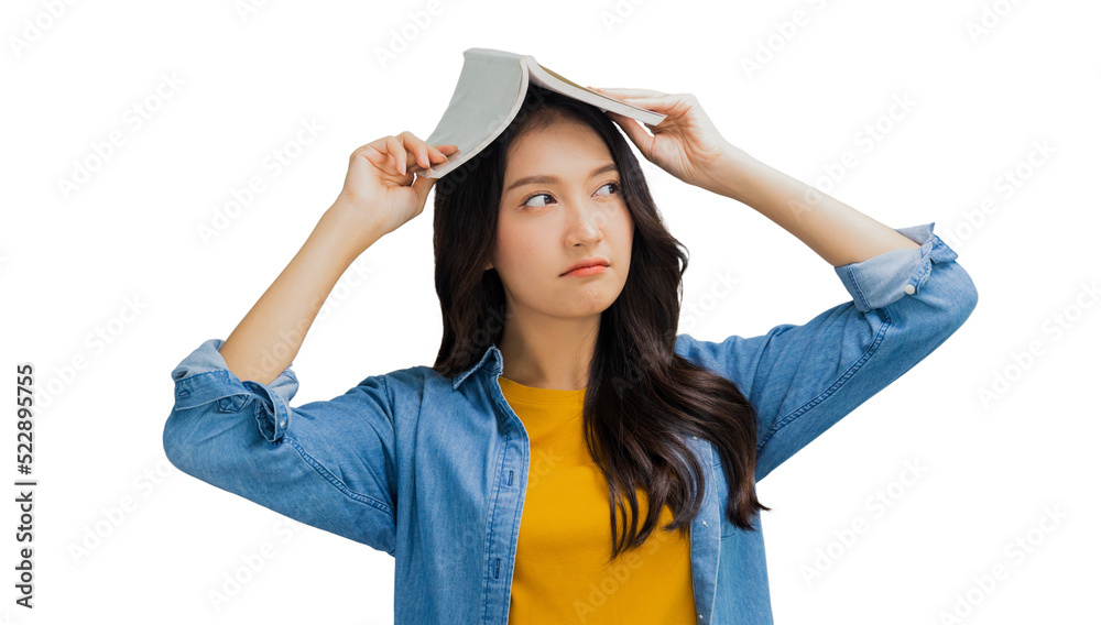Beautiful Asian woman boring and holding book on her head, tired and bored young girl student