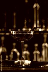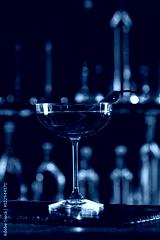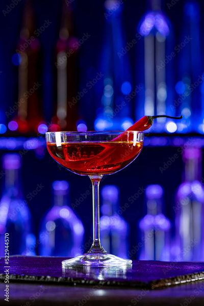 Cocktail with hot chilli pepper on bar counter in a restaurant, pub. Fresh spicy drink. Alcoholic cooler beverage at nightclub on dark background