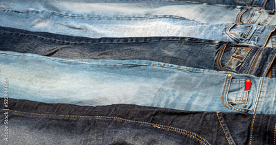 Various blue jeans pants or trousers made of blue-colored denim cloth. Closeup abstract texture cotton fabric for background design. Pair of jeans, pockets, rivets, buttons, seams
