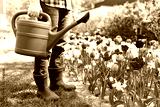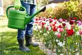 gardening and people concept - close up of man with watering can and tulip flowers at garden