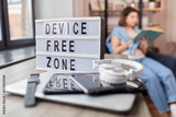 digital detox and leisure concept - close up of device free zone words on light box, gadgets on table and woman reading book at home